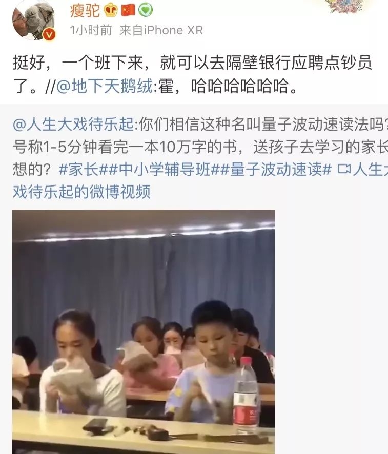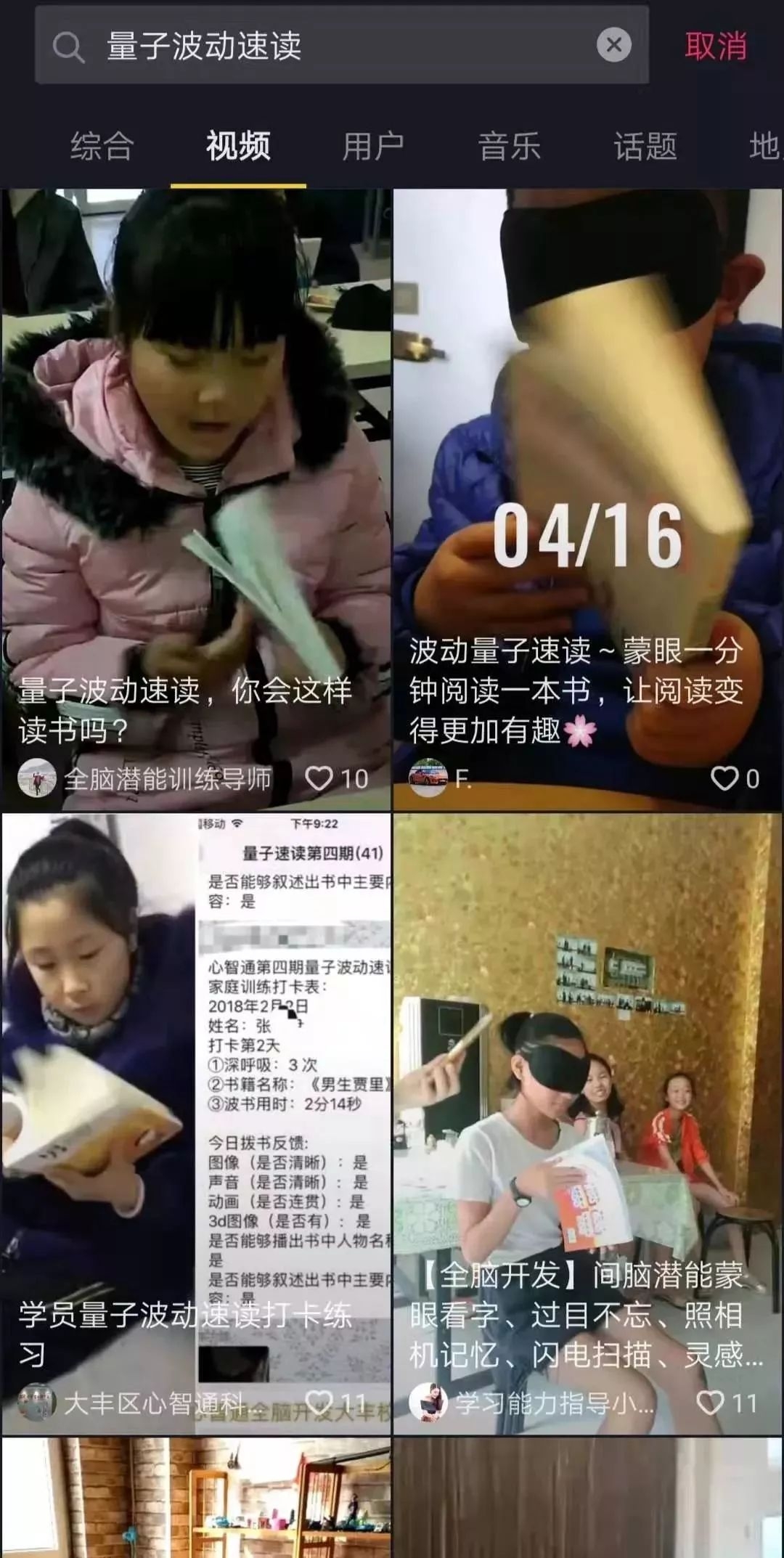近日,微博上流传出多个某教育机构组织6-10岁儿童进行量子波动速读大赛及日常学习的视频。视频中,孩子们围坐在一个大房间里不停埋头翻书:“翻得越快,你和宇宙的距离就越近!”↓