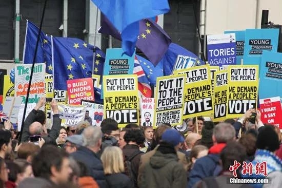 △3月23日,在欧盟同意英国延迟脱欧、英国脱欧前景仍面临“灾难的不确定性”困境之际,伦敦市中心举行了大规模呼吁举行“第二次脱欧公投”的示威游行。中新社记者 张平 摄