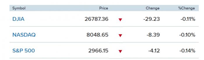 当地时间周一,美股收盘小幅下跌,道琼斯工业平均指数下跌29.23点或0.11%,收于26787.36点。标普500指数下跌0.14%至2966.15点。纳斯达克综合指数也下跌0.10%至8048.65点。周一是哥伦布日假期,美国债券市场休市。