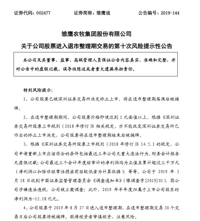 从A股“养猪第一股”到进入退市整理期,雏鹰退仅用了4个月。