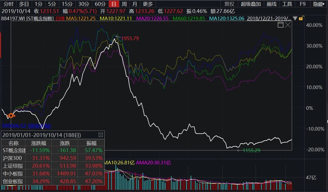 如果说去年年底至今年4月底,ST概念指数与上证综指、沪深300、中小板指、创业板指等主要指数走势大体保持一致的话,Wind数据显示,自今年5月开始,ST概念指数走势就开始与上述主要指数“分道扬镳”,即便是其他主要指数大幅上涨,ST概念指数整体也表现平平。截至10月14日收盘,在今年主要指数上涨20%以上的大背景下,ST概念指数却下跌11.59%。