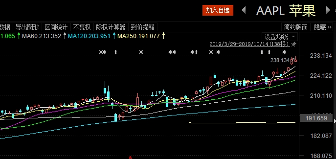 截至2019年10月14日晚11:30分(美东时间10月14日上午11:30分),苹果股价已达237.44美元/股,这一价格相较年初也已上涨超50%,相较1月份142.3美元/股的最低点则已上涨超60%,而其总市值也达约1.07万亿美元,成为全球市值最高的上市公司,同期微软市值约1.06万亿美元。