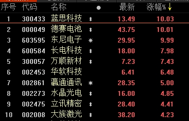 10月14日,A股苹果概念股多数飘红,多只个股涨停,如蓝思科技、德赛电池、东尼电子等,另外长电科技、万顺新材、华软科技等个股亦涨逾6%。