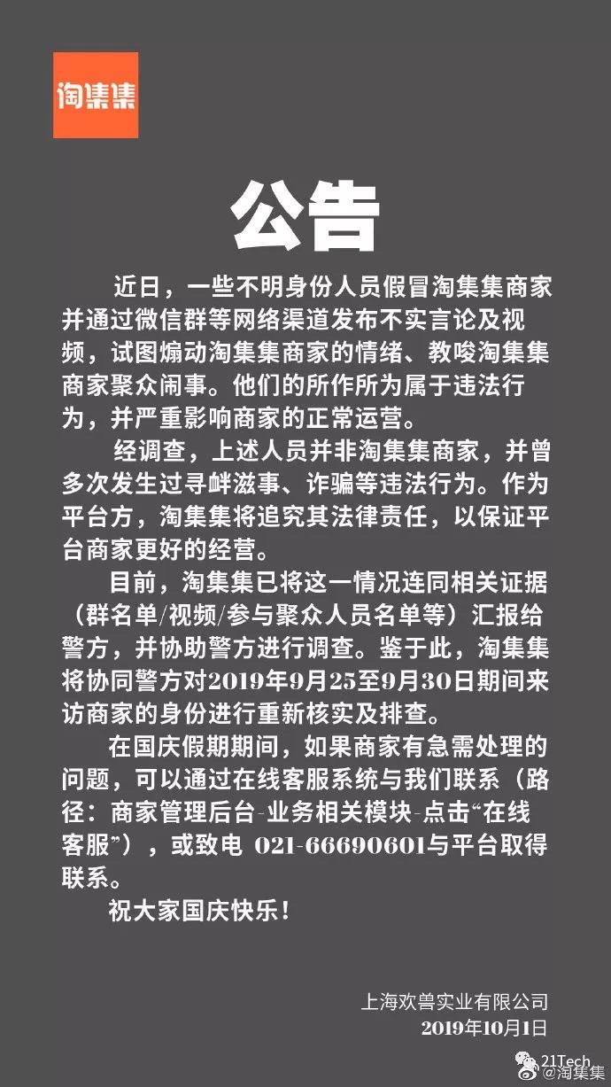 真正的危机爆发在刚刚过去的国庆节,10月1日,淘集集在官方微博发布公告,称近日有不明身份人员假冒淘集集商家并发布不实言论及视频,已将相关情况连同证据汇报给警方以协助调查。