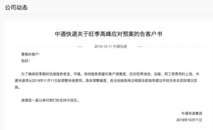 中通快递官网当天发布了一则“关于旺季高峰应对预案的告客户书”,称将从2019年11月11日起调整快递费用。