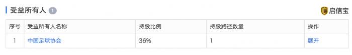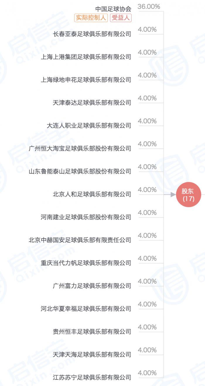 据启信宝数据显示,中超联赛有限责任公司成立于2006年4月,由中国足球协会持股36%,为该公司的最大股东和最终受益人。山东鲁能泰山足球俱乐部股份有限公司、上海上港集团足球俱乐部有限公司等16只足球俱乐部分别持股4%。目前营范围主要包括:组织体育比赛;广告业务;版权开发与转让;体育用品、纪念品、文化用品的销售;与以上业务相关的信息咨询与服务。