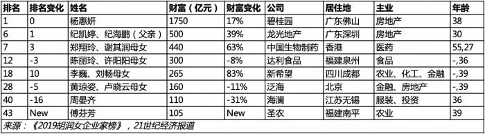 10月16日,胡润研究院发布《2019胡润女企业家榜》(Hurun Richest Women in China 2019),这是胡润研究院连续第十四次发布“胡润女企业家榜”前50名。