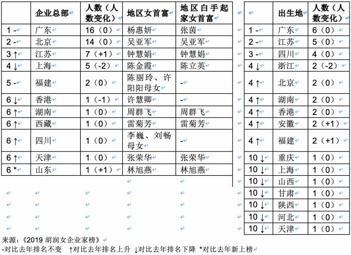 以企业总部所在地为标准,50位女企业家的公司,有16家位于广东,14家位于北京,其后是江苏、上海、福建等地。胡润研究院称,今年首次没有总部浙江的女企业家上榜。