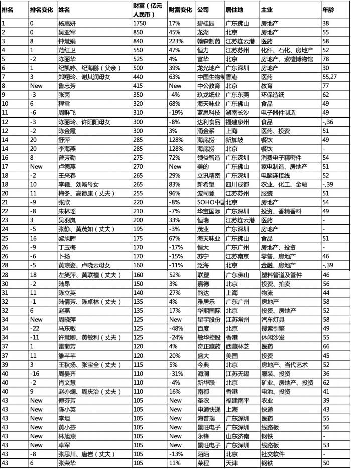 胡润Top 50女企业家榜单:8位“80后”上榜,广东企业占16席