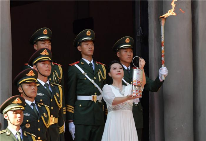 2019年8月1日,采火使者方铭璐(前右)在展示圣火火种。当日,第七届世界军人运动会圣火火种采集和火炬传递启动仪式在江西省南昌市举行。新华社记者 彭昭之 摄