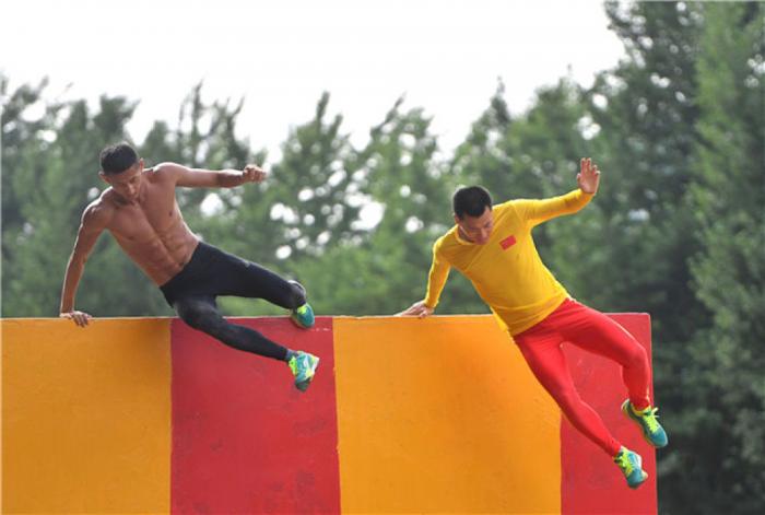 2019年8月5日,八一空军五项队队员王佳在进行障碍跑训练。新华社记者 程敏 摄