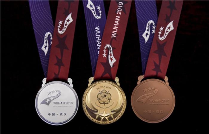 2019年10月10日,第七届世界军人运动会执委会在武汉举行新闻发布会,公布了本届军运会奖牌、奖杯等颁奖物资。军运会奖牌“和平友谊之星”、军运会奖杯“腾飞”等正式亮相。这是10月10日拍摄的本届军运会银牌背面图案、金牌正面图案、铜牌背面图案(从左至右)。新华社记者 程敏 摄