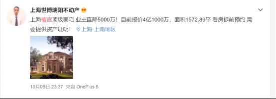 还有一条9月份发布的微博称檀宫1572.89平的别墅售价5.5亿。