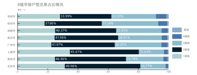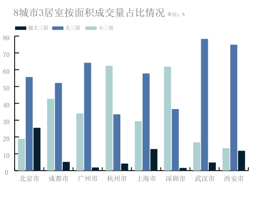 面积方面,杭州及深圳多选择“小三居”。其他城市多选择“大三居”,“超大三居”成交情况中,占比最高的为北京市,占比约为25.45%。