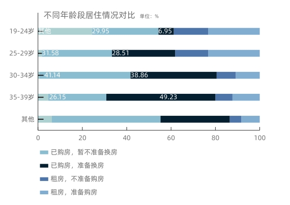 调研数据显示,35-39岁年龄段中,“已购房,准备换房”比例约为49.23%,而19-24岁年龄段中,这一比例约为6.95%,随着年龄段增加,“已购房,准备换房”占该年龄段比例也随之增加,35-39岁年龄段进入“换房高峰期”。