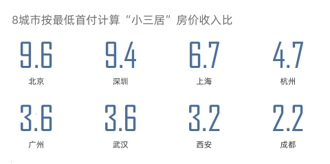 不过,报告也指出,现实情况中全款比例较小,以深圳2019年前三季度3居室交易情况来看,全款仅占6.31%,约67.56%选择商业贷款。如果按照各城市最低首付比例计算(如北京35%,成都30%),相应的房价收入比会显著减少。