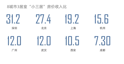 根据上海易居房产发布的《2019年上半年全国50城房价收入比报告》显示,深圳2019年上半年房价收入比为36.1。《2019理想三居报告》显示,如果按照套均价格计算房价收入比,深圳房价收入比远高于其他城市。在小三居,房价收入比约为31.2,购房难度最高。广州为12.0,低于深北上。