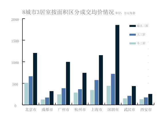 价格方面,一线城市成交均价明显高于新一线城市,其中60-90平米面积区间(“小三居”),北京成交均价最高约为512万元/套,成都成交均价最低,约为125.6万元/套;90-140平米面积区间(“大三居”),深圳成交均价最高,约为720.1万元/套,成都最低约为170.8万元/套;140平米以上面积区间(“超大三居”),深圳成交均价最高,约为1852.6万元/套,西安成交均价最低,约为254.3万元/套,广州在1000万元/套左右。