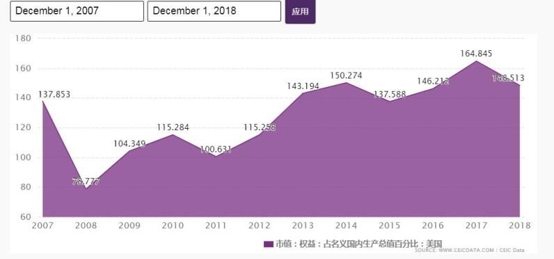 另一个巴菲特最喜欢的市场指标是,市值与GDP的比值。两者之比在2000年互联网泡沫高峰期飙升146%,在2008年金融危机爆发之前飙升137%,2018年达到148.5%。