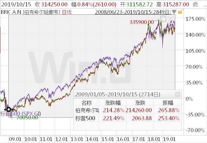 从2009年伊始至今,伯克希尔哈撒韦的股价涨幅确实也跑输了标普500指数。