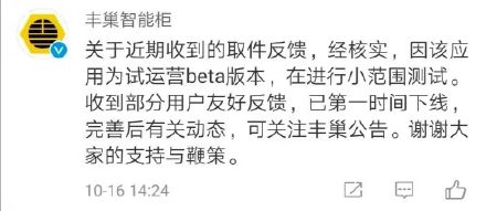 丰巢随后马上下线这一功能。@丰巢智能柜官方微博回应:关于近期收到的取件反馈,经核实,因该应用为试运营beta版本,在进行小范围测试。收到部分用户友好反馈,已第一时间下线,完善后有关动态,可关注丰巢公告。谢谢大家的支持与鞭策。