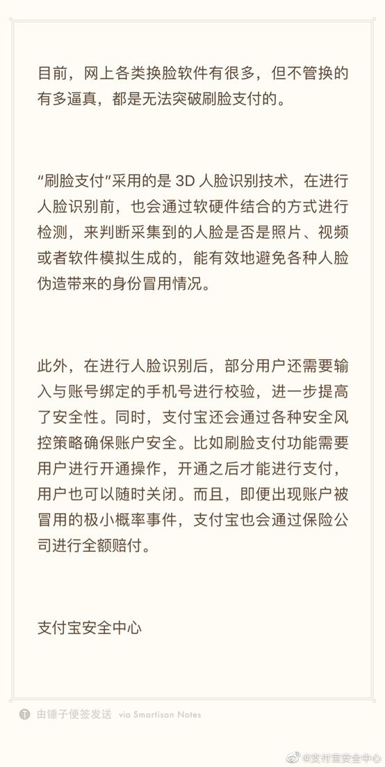 支付宝给出的回答是,目前网上各类换脸软件很多,但不管换得有多逼真,都不用担心支付宝刷脸支付的安全性。