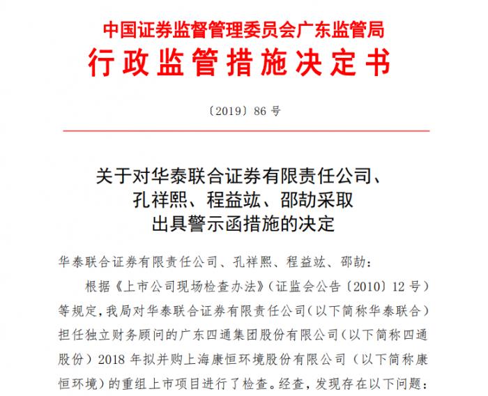 10月12日,因华泰联合证券有限责任公司(以下简称“华泰联合证券”)在2018年为广东四通集团股份有限公司(以下简称“四通股份的重组上市项目担任独立财务顾问时,对拟并购标的上海康恒环境股份有限公司(以下简称“康恒环境”)股权评估不准确、关联交易披露不充分、财务信息披露不准确、不完整,华泰联合证券及相关责任人收到了广东证监局的警示函。这也是华泰联合证券在两月内收到的第二张警示函。