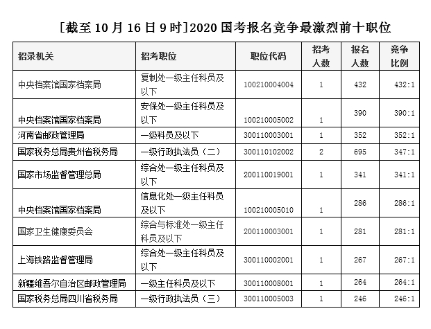 据新京报提供的最新数据显示,截至16日9时,中央档案馆国家档案局“复制处一级主任科员及以下”一职位,招考1人,已有432人报名,仍然处在竞争比最高的位置。