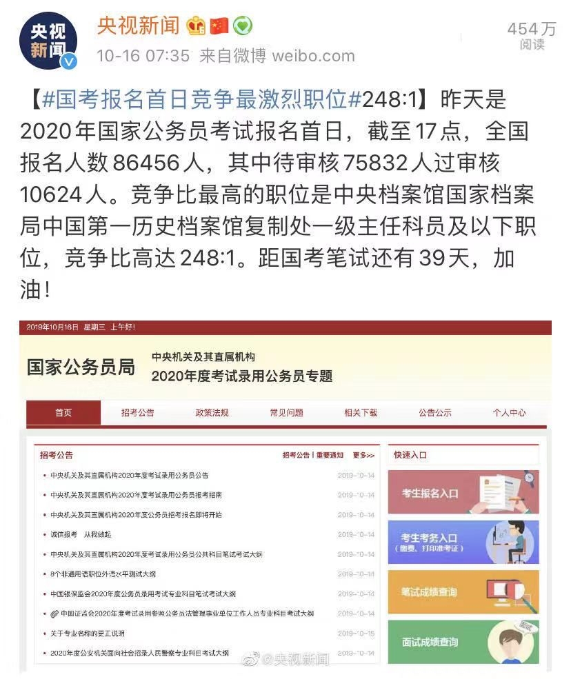 10月15日,是2020年国家公务员考试报名的首日。据统计,截至当天17点,全国报名人数86456人 ,其中待审核75832人,过审核10624人。平均竞争比为8.03:1,超过去年同期4.7:1。