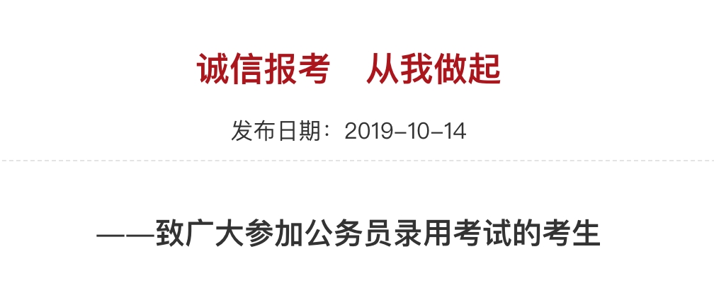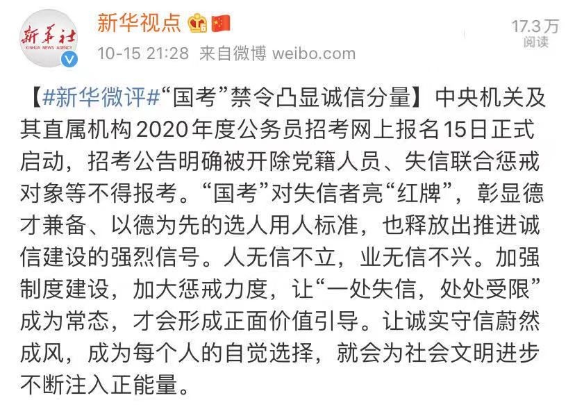 10月15日,@新华视点 发表微评:“国考”对失信者亮“红牌”,彰显德才兼备、以德为先的选人用人标准,也释放出推进诚信建设的强烈信号。