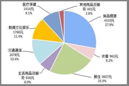 前三季度,全国居民人均食品烟酒消费支出4310元,增长6.1%,占人均消费支出的比重为27.9%;人均衣着消费支出962元,增长3.8%,占人均消费支出的比重为6.2%;人均居住消费支出3607元,增长10.3%,占人均消费支出的比重为23.3%;人均生活用品及服务消费支出926元,增长3.2%,占人均消费支出的比重为6.0%;人均交通通信消费支出2078元,增长7.6%,占人均消费支出的比重为13.4%;人均教育文化娱乐消费支出1766元,增长13.5%,占人均消费支出的比重为11.4%;人均医疗保健消费支出1414元,增长10.9%,占人均消费支出的比重为9.1%;人均其他用品及服务消费支出401元,增长11.1%,占人均消费支出的比重为2.6%。