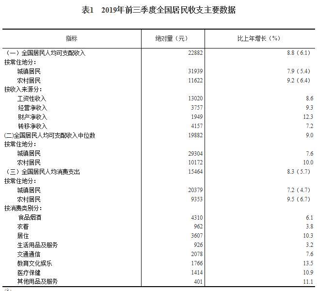 10月18日电 据国家统计局网站消息,国家统计局今日发布2019年前三季度居民收入和消费支出情况。数据显示,2019年前三季度,全国居民人均可支配收入22882元,比上年同期名义增长8.8%,扣除价格因素,实际增长6.1%。