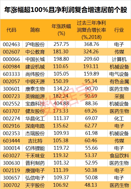 以涨幅超100%的146股来看,过去三年净利润复合增速为正的股票数量占比超六成。涨幅超400%的宝鼎科技净利润复合增速达到88.36%。沪电股份、中公教育、中国长城、建设机械、尚纬股份及中钢天源5股净利润复合增速位居前五位,均超过150%,5股年内股价分别上涨257.75%、181.3%、198.8%、110.65%及105.05%。