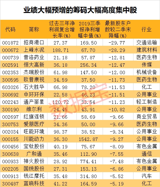 从最新三季度业绩来看,川能股份、神火股份、恒大高新等5股净利润增幅中值有望超2.5倍,其中恒大高新筹码集中度高达12.47%。从筹码集中度来看,招商港口、普洛药业、杰瑞股份等10股最新股东户数较二季末降幅均超过10%,其中,招商港口筹码快速集中,最新股东户数较二季末下降近30%。