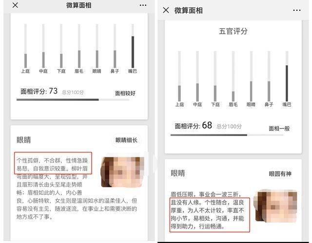 南都记者按照要求在“微算面相”中上传了一张人脸正面照,随后页面显示进入了人脸扫描环节,测量三庭长度、定位五官、综合分析等,几秒后便生成一份面相报告。报告显示了五官评分,并附有面相概述、五官各项分析等内容。不过,从整体来看,报告的描述十分笼统。而且,报告仅显示部分,剩余项目需要付费解锁。