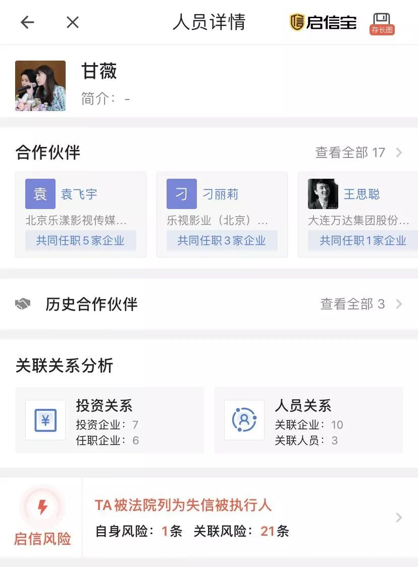 启信宝数据还显示,目前有多条与甘薇有关的关联风险,以她担任法人代表的北京乐漾影视传媒有限公司为例,其股权就被冻结,并且有官司缠身。