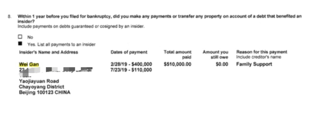 该份文件同时显示,贾跃亭在提交破产申请前的一年之内,曾于今年2月28日和7月23日分别向甘薇转账40万美元和11万美元,总计51万美元,在用途一栏标注的是“家庭费用”。