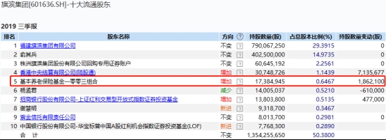 还有,基本养老保险基金一零零三组合在2019年三季度增持了旗滨集团,持有1738.49万股,占总股本的0.65%,位列第五大流通股东。