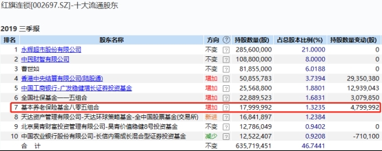 同时,基本养老保险基金八零五组合还买进了红旗连锁,持有1800万股,占总股本的1.32%,位列第七大流通股东,较上一季度有所增持。