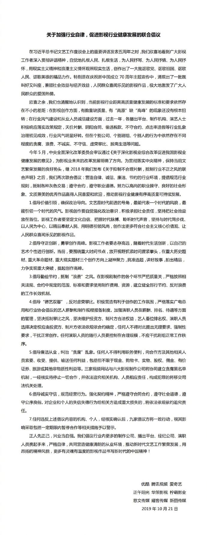 10月21日,优酷、腾讯视频、爱奇艺三家视频网站联合正午阳光、华策影视、柠萌影业、慈文传媒、耀客传媒、新丽传媒六大影视制作公司发布联合倡议,呼吁加强行业自律,促进影视行业健康发展,营造自律、诚信、廉洁、节约的行业环境。这是9家公司继去年发布《关于抑制不合理片酬,抵制行业不正之风的联合声明》之后,再次发出联合倡议。