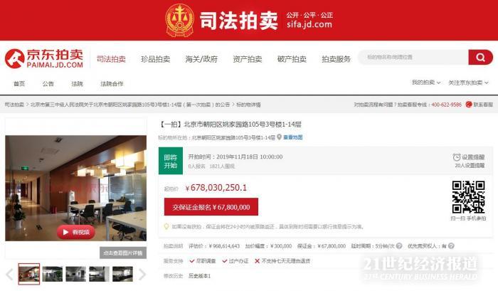 根据北京市第三中级人民法院官网公告,其将于11月18日10时至11月19日10时止,在京东网司法拍卖网络平台上首次公开拍卖北京市朝阳区姚家园路105号3号楼1-14层,评估价为9.69亿元,起拍价6.78亿元,起拍价相当于评估价的7折。