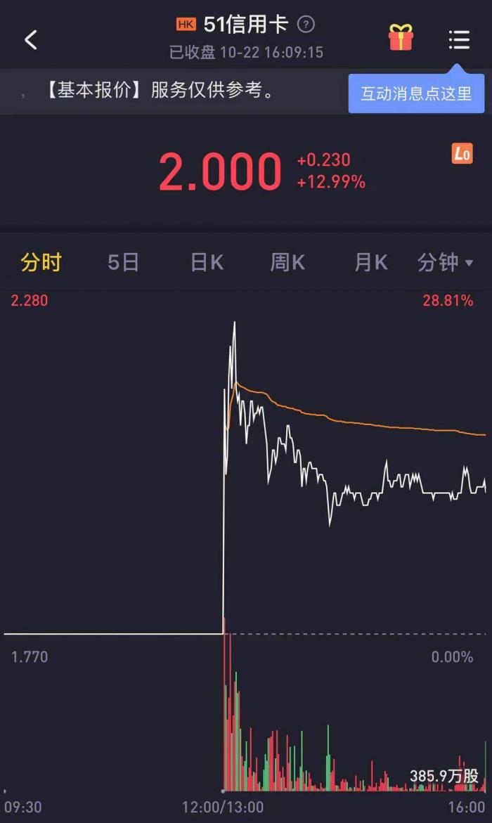 值得一提的,因涉嫌暴利催收,暴跌35%之后,51信用卡于今日下午1点复牌,上涨近25%,截至收盘,上涨12.99%,报2港元/股。