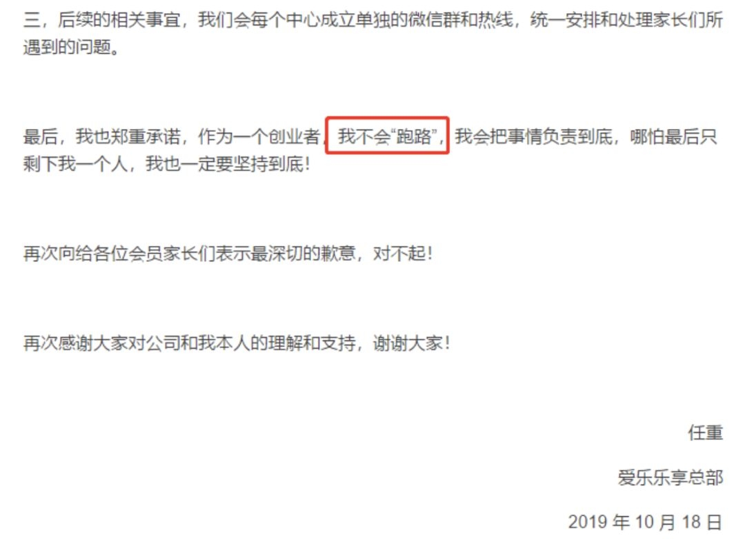 闭店事件发生后,法定代表人任重公开发文称不跑路,但记者多次拔打其电话始终无人接听。记者发现,就连其发给内部员工的致歉信都疑似大篇幅抄袭某集团创始人10月15日就“欠薪事件”发布的《致全体员工的一封信》。