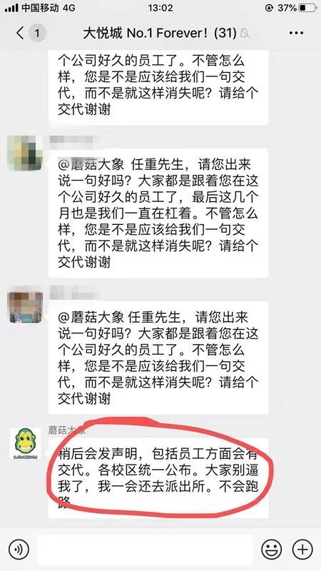 “各个中心的员工和老师都在群里,希望老板出来说句话,给大家一个解释,但任重不予回复,并直接退群了。”一位全职授课老师对记者说道。