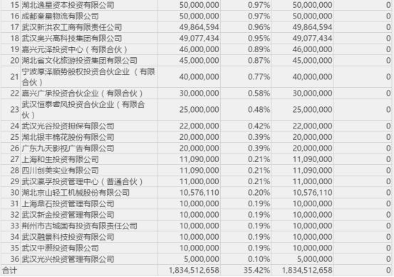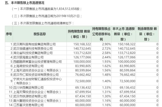 根据天风证券10月15日发布的公告,此次上市流通的限售股股东数量有36名,其中武汉高科、武汉恒健通科技、湖北省科技投资集团、武汉银海置业等14家机构持有的限售股占公司总股本比例超过1%,5家机构持有限售股数量超过1亿股。