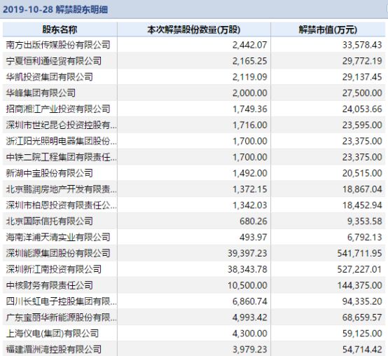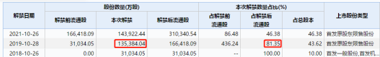 按照长城证券《首次公开发行股票上市公告书》,此次首发原股东限售股份可上市交易时间为2019年10月26日,但因为本周六是非交易日,故顺延至10月28日。当日,长城证券13.54亿股首发原股东限售股份将上市流通,占解禁后流通股的比例为81.35%,占总股本的比例为43.62%。