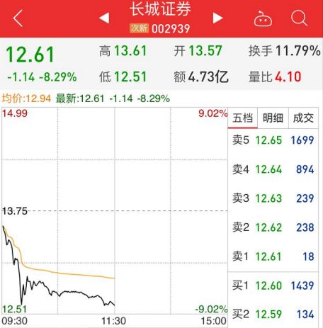 巨量解禁带来的股价压力早已提前反映到长城证券的股价中。近期,长城证券股价持续走弱,已连跌6日。先跌为敬,今日上午开盘,公司股价便开始下探,随后跌幅不断扩大,截至今日上午收盘,长城证券股价报收12.61元/股,跌幅高达8.29%,总市值达391亿元。