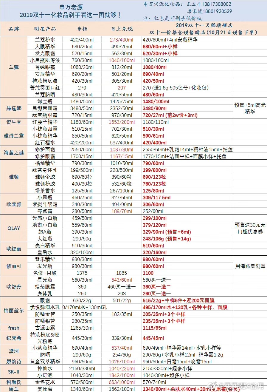 这边各位消费者熬夜买买买,那边券商研究员也正忙着。申万宏源两位分析师王立平、唐宋媛做了一张名为《申万宏源:2019双十一化妆品看这一张图就够!》的图,对十余种知名化妆品的专柜价、日上免税价和天猫旗舰店预售价进行了对比。