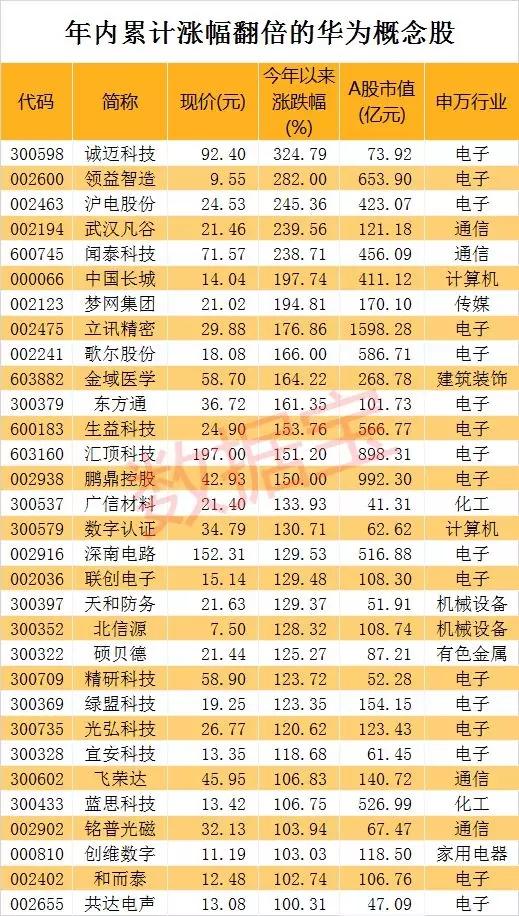 而从最新数据来看,不含今年上市的次新股,华为概念股年内股价翻倍股已经达到31只。年内累计涨幅最大的是诚迈科技,累计涨幅3.25倍。领益智造、沪电股份、武汉凡谷、闻泰科技年内累计涨幅均在2倍以上。累计涨幅翻倍的还有中国长城、梦网集团、立讯精密、歌尔股份、金域医学等。