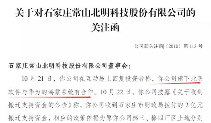 不过,常山北明今日最新回应媒体称,与华为在鸿蒙方面的合作,其实并没有签署任何实质性文件,目前只是在洽谈意向。公司强蹭热点的行为,也引发交易所关注,今日晚间,公司收到深交所问询函,要求公司说明与华为鸿蒙系统的合作事项在最近两个会计年度及预计未来年度对公司的收入及利润贡献情况、收入占比及变化趋势。